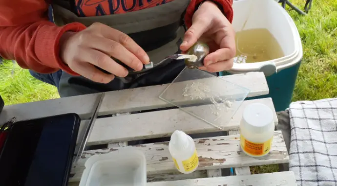 Les premières phases, réalisées en décembre 2023, ont permis de localiser les moules grâce à des prospections visuelles en plongée 🤿 et à pied et grâce à l’utilisation de telliniers, instruments facilitant la recherche d’individus enfouis dans le substrat.